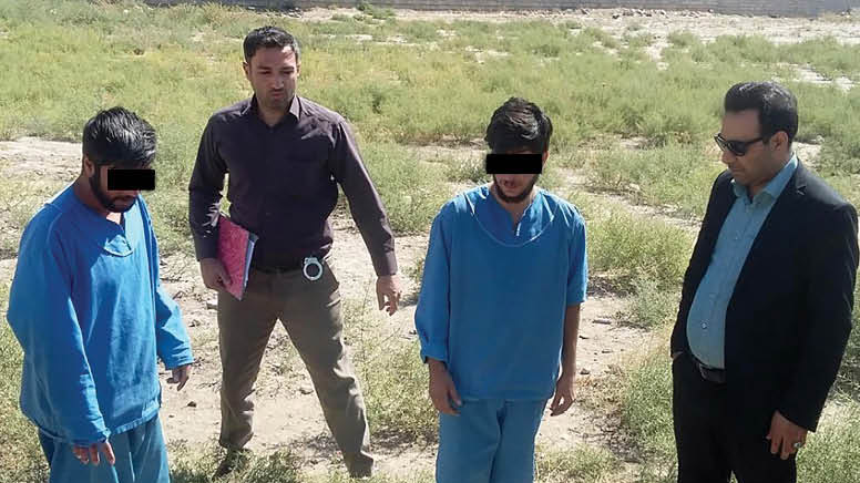 متهم به قتل متهمان در حال نشان دادن محل دفن جسد به قاضی ویژه قتل عمداین جوان که همه چیز را لو رفته می دید، در همان بازجویی های اولیه لب به اعتراف گشود و گفت: با پیشنهاد مبالغ بالا راننده تیبا را به مکان خلوتی بردیم تا خودرو را سرقت کنیم ولی او مقاومت می کرد و رمز کارت های بانکی اش را نمی داد. به همین دلیل او را با ضربات چاقو وادار کردیم تا رمزها را بدهد. سپس برادرم طنابی را به دستم داد و من با آن راننده را در صندلی عقب خفه کردم و بعد هم جسد را با همکاری برادرم دفن کردیم.متهم به قتل ادامه داد: برای آن که شناسایی نشویم، اموال سرقتی از راننده را در جاده بهشت رضوان زیر خاک کردیم و سپس من به زابل فرار کردم تا شناسایی نشوم. چشم به پابندهای آهنینی دوخته بودند که حلقه های آن قوزک پاهایشان را می فشرد. باورشان نمی شد با نقشه زیرکانه ای که برای جنایت طراحی کرده بودند، این گونه در دام کارآگاهان پلیس آگاهی خراسان رضوی قرار گیرند.